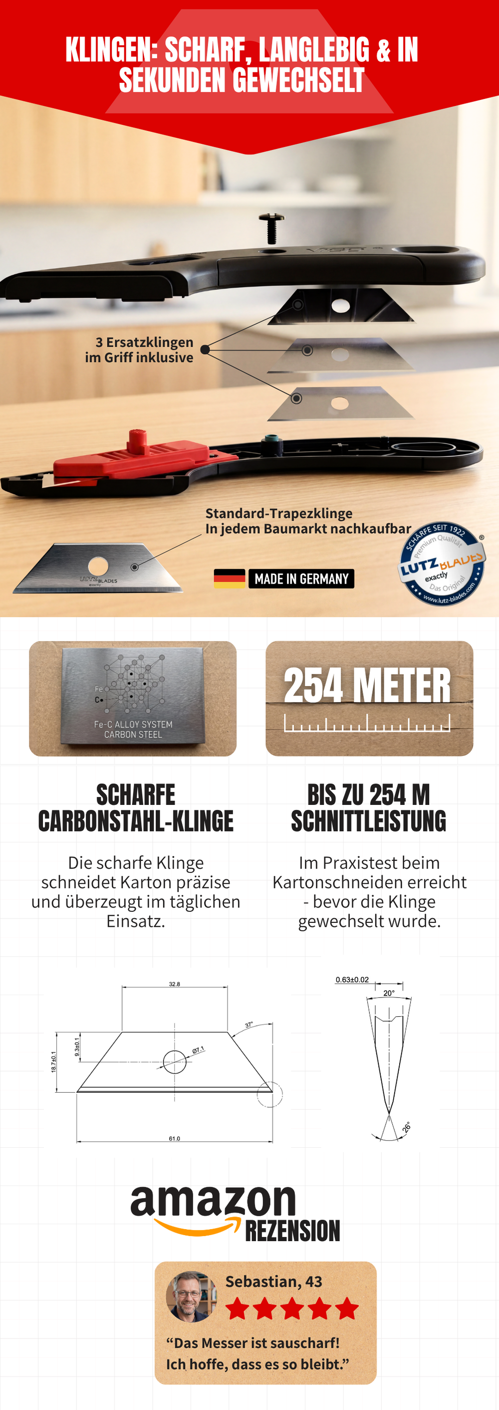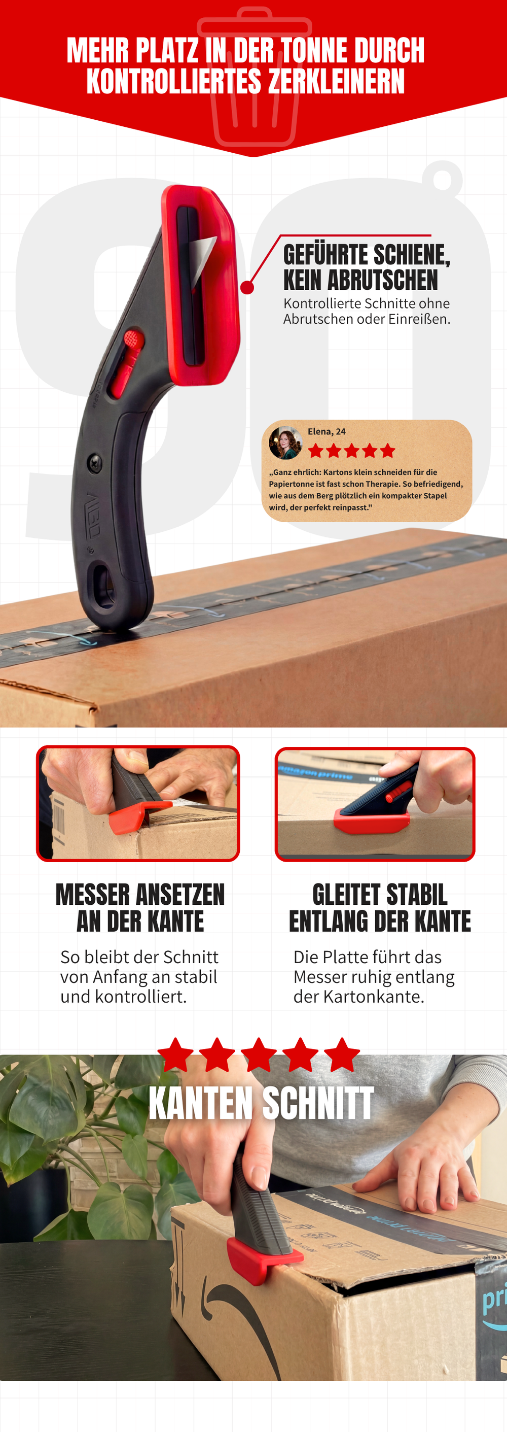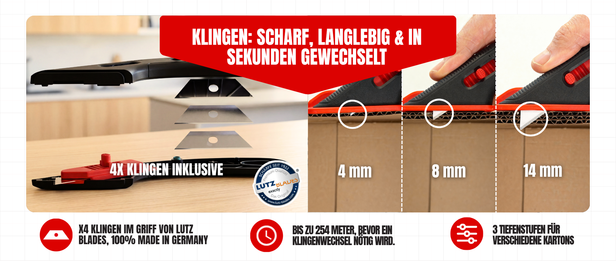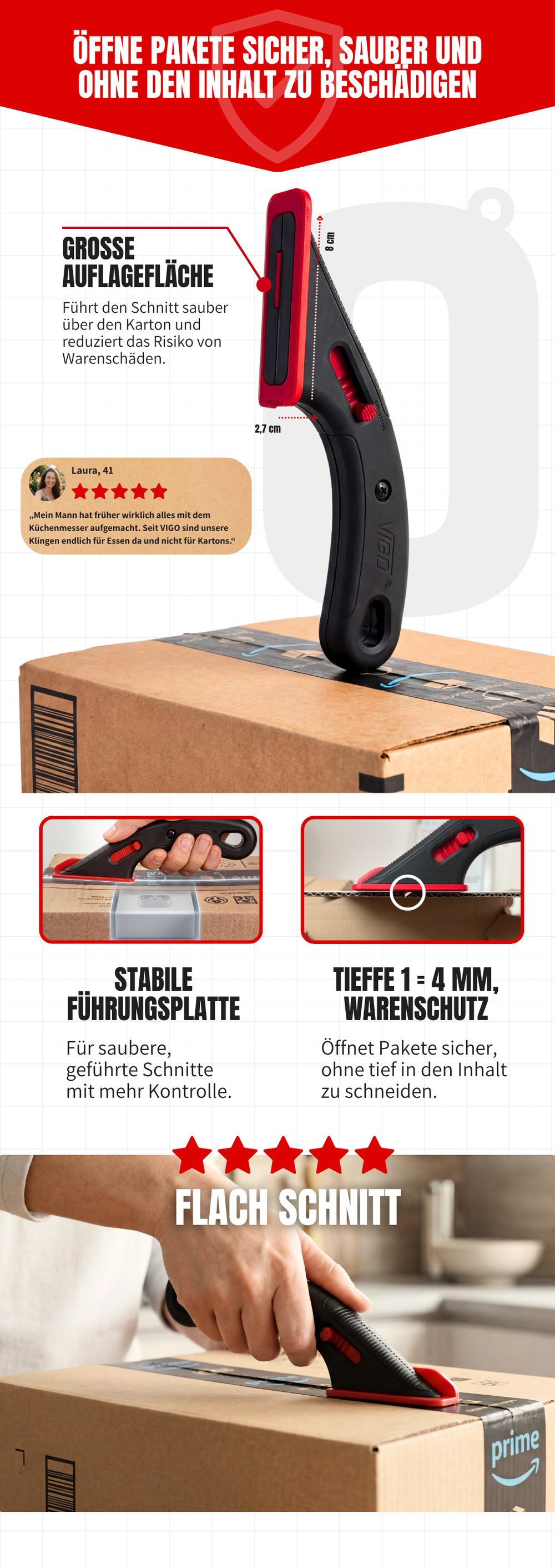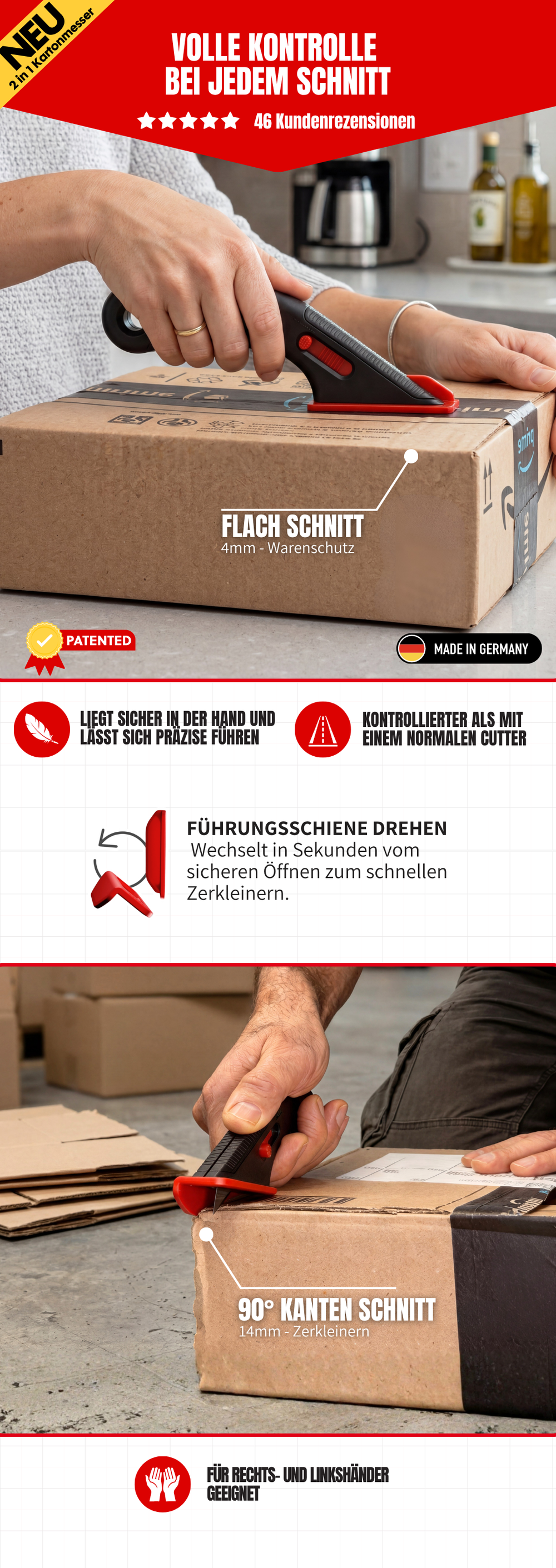Insgesamt hat man hier ein Messer, bei dem die Klinge geführt wird und nicht frei liegt, sodass Schnitte kontrolliert bleiben und der Inhalt geschont wird. Sehr hilfreich für alle, die regelmäßig Pakete öffnen oder Karton zuschneiden und dabei gleichmäßig und sicher arbeiten wollen.